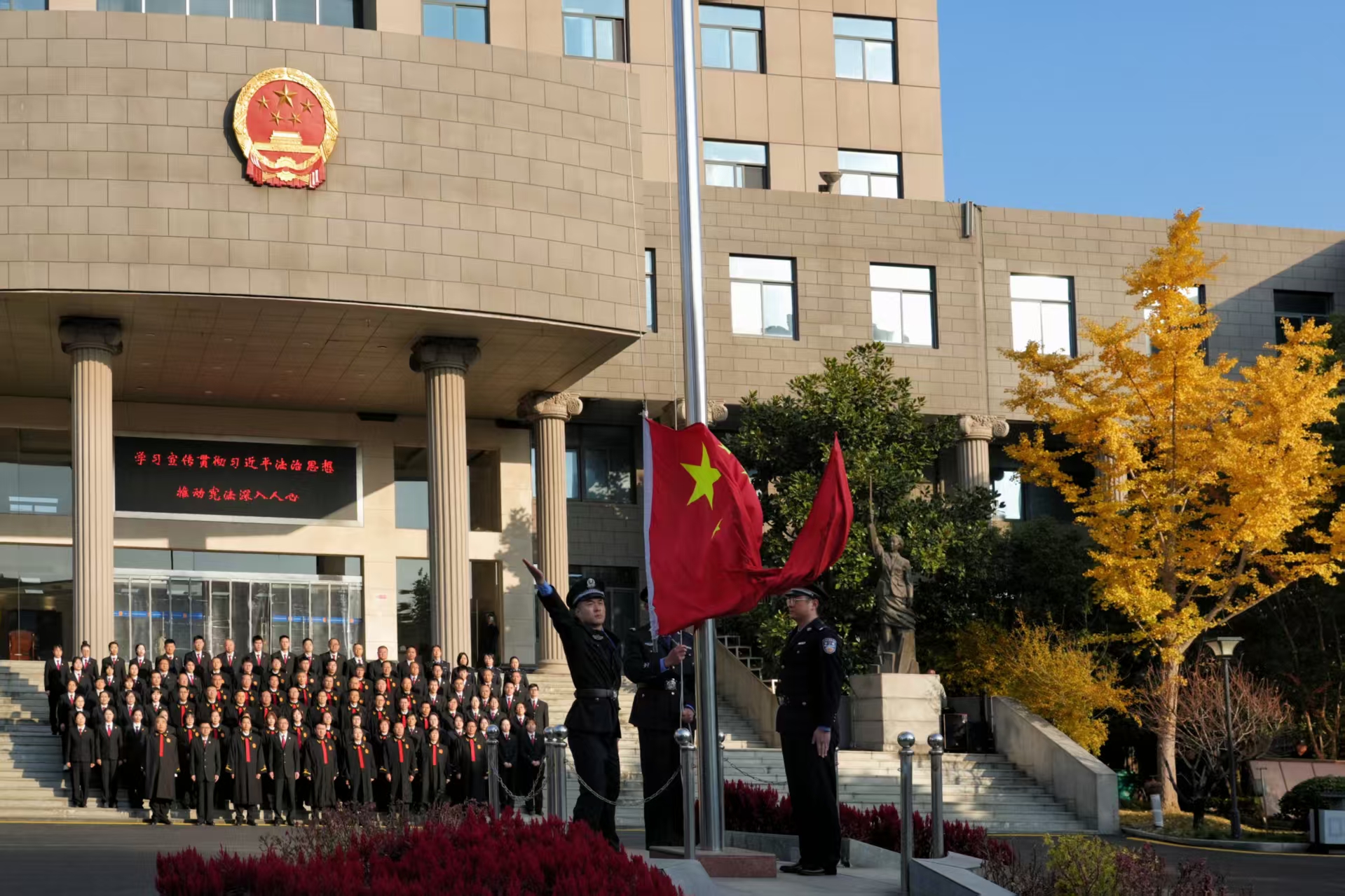 旭日初升,晨光照耀。庄严的升旗仪式拉开序幕,法警们步伐铿锵,护卫着五星红旗行进至升旗台上。伴随着雄壮的《义勇军进行曲》,鲜艳的国旗在朝阳中冉冉升起,迎风飘扬。全体干警肃然而立,向国旗行注目礼,并高唱国歌。