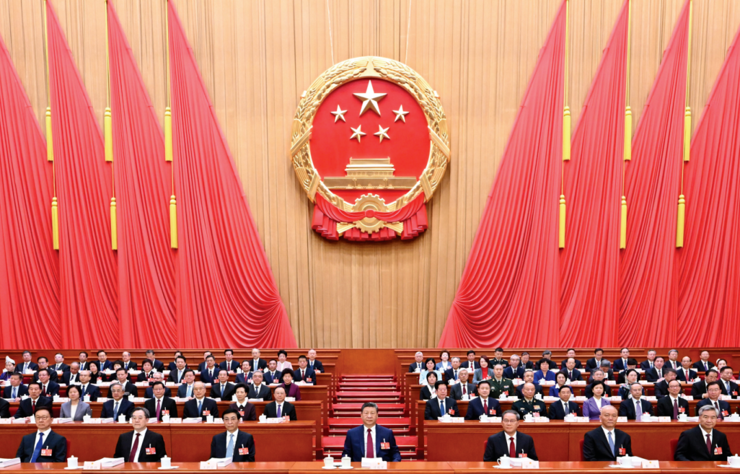 第十四届全国人民代表大会第四次会议5日上午在北京人民大会堂开幕。全国人大代表肩负人民重托出席大会,履行宪法和法律赋予的神圣职责。 人民大会堂万人大礼堂气氛庄