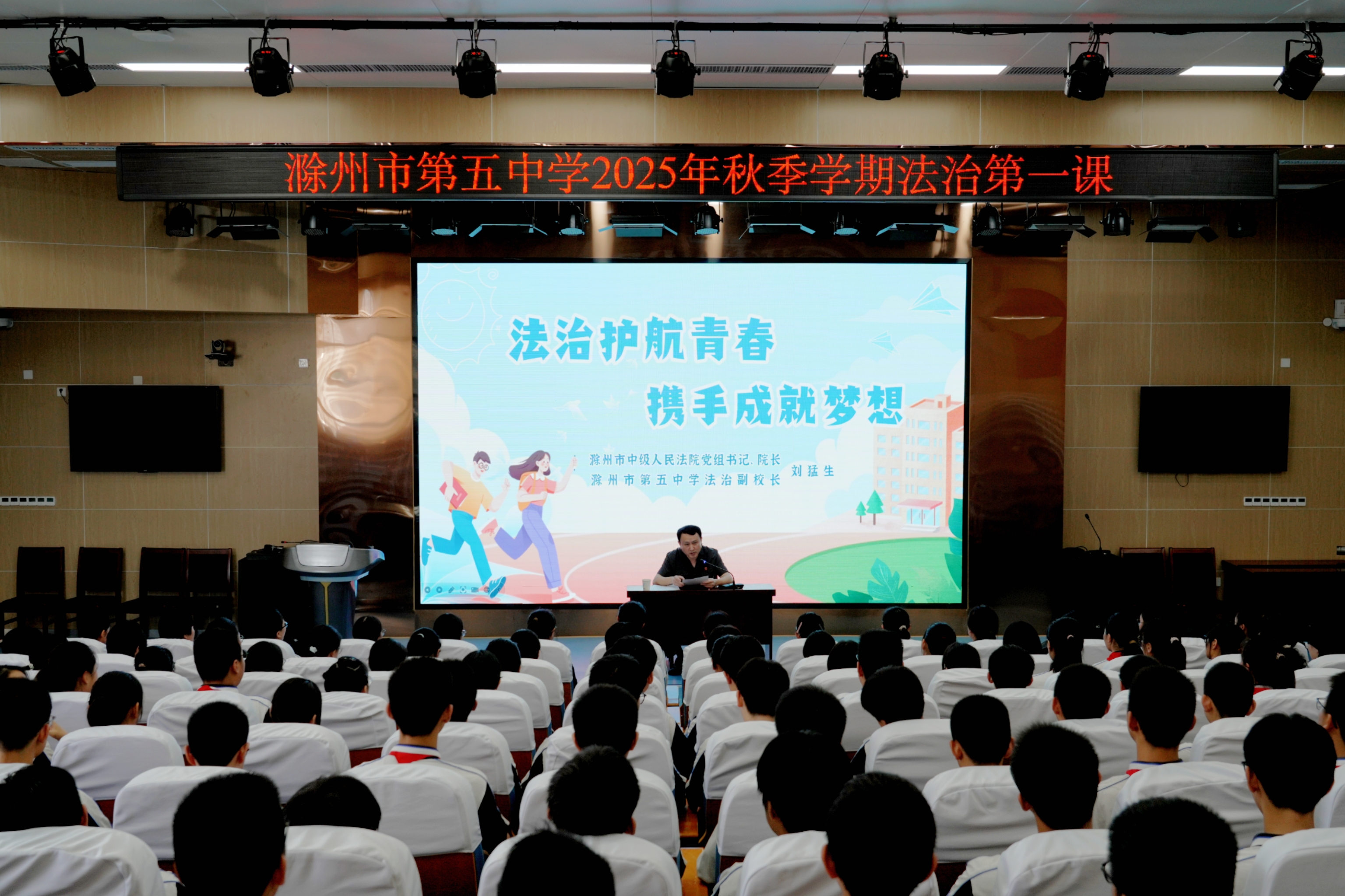 近日,滁州市中级人民法院党组书记、院长刘猛生以法治副校长的身份,为滁州市第五中学九年级百余名学生讲授主题为“法治护航青春 携手成就梦想”的法治第一课。