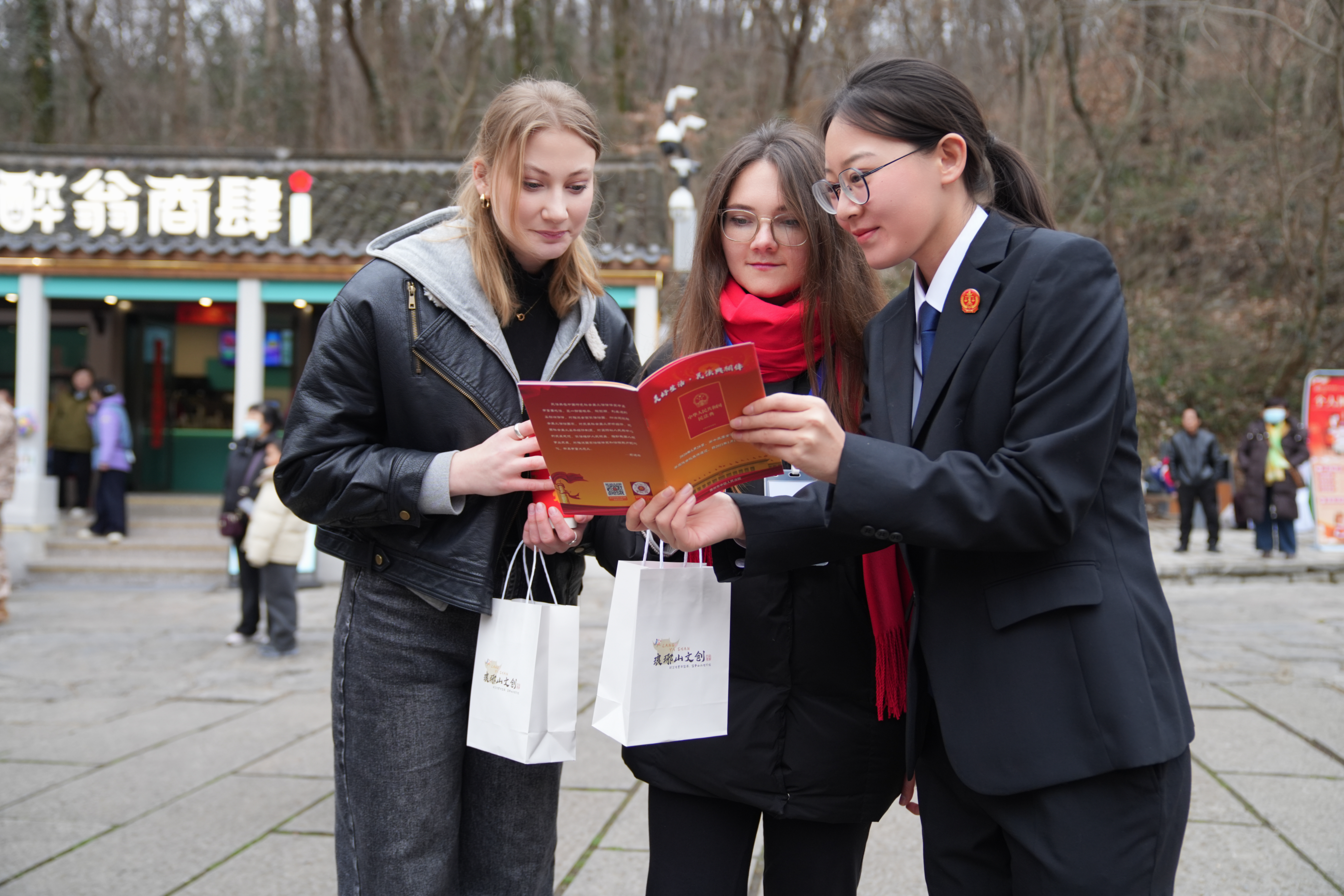 在醉翁亭旁欧梅树下,干警们向留学生们和过往游客耐心讲解,介绍了法院设立千年古树司法守护人,以及联合多部门专门为保护古树名木采取的相关举措,呼吁广大游客爱护生态环境,共同保护“有生命的文物”。